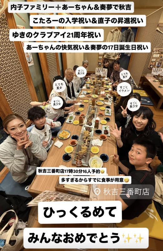 日曜日は内子ファミリー➕あーちゃん&奏夢で17時30分から16人で秋吉😆