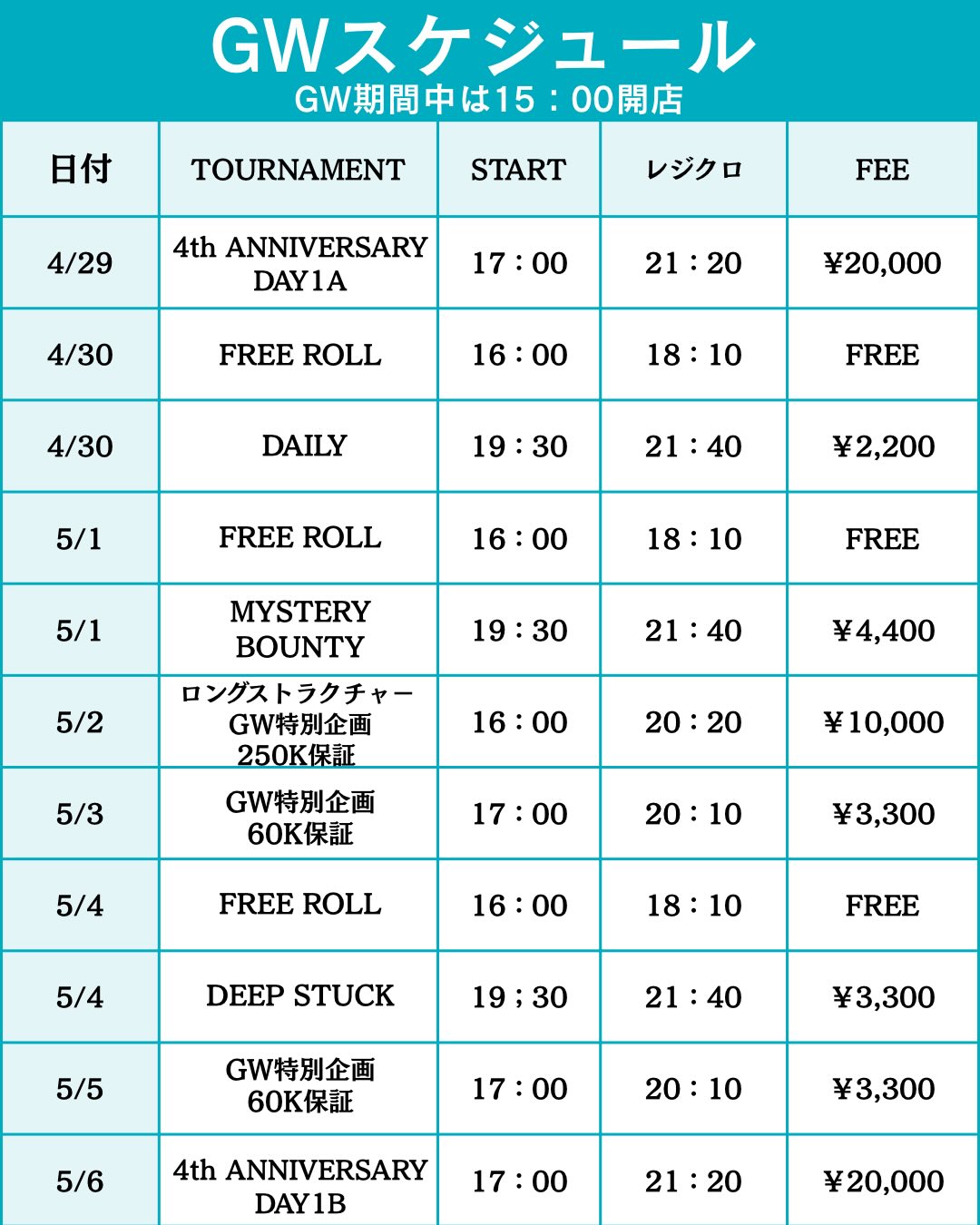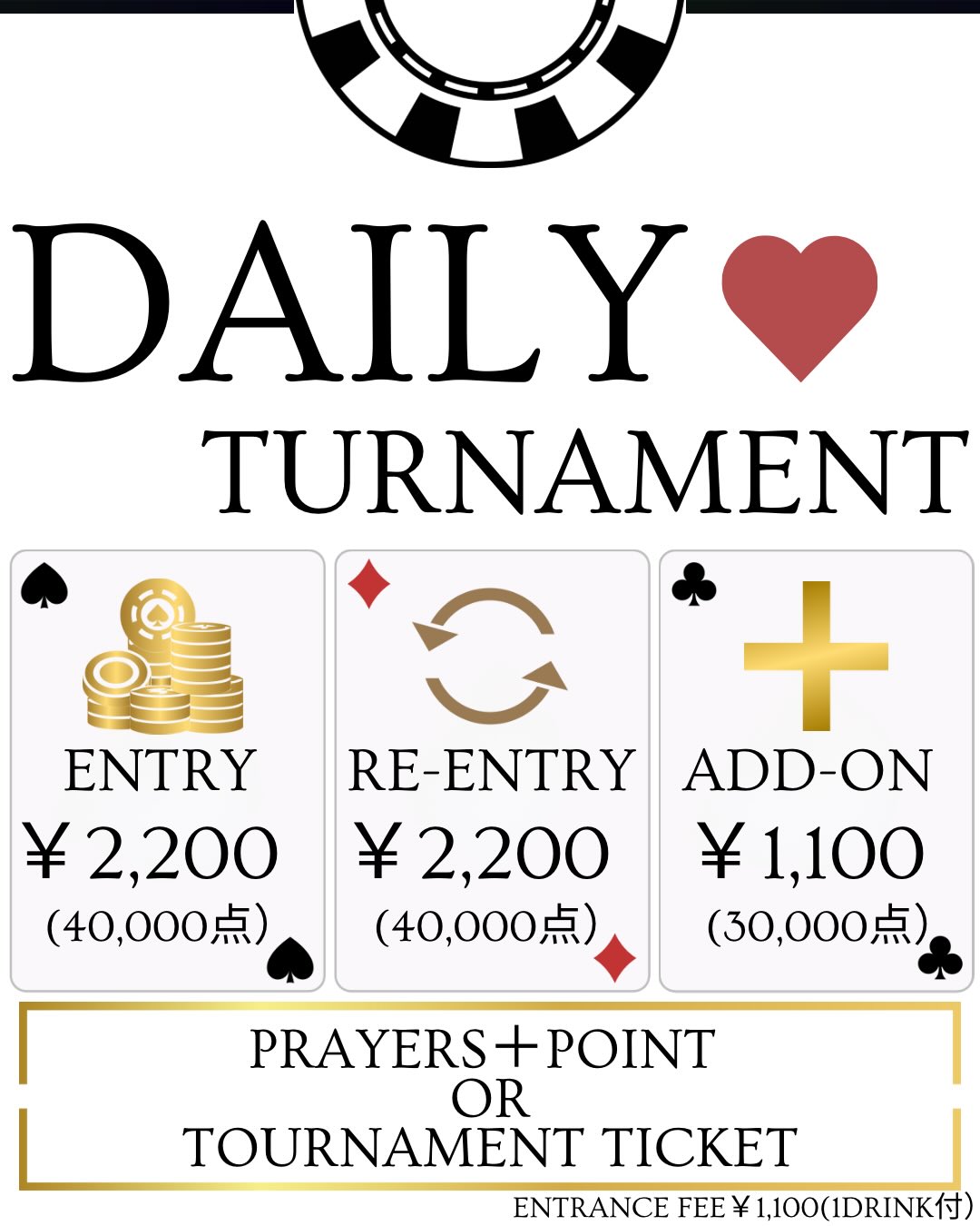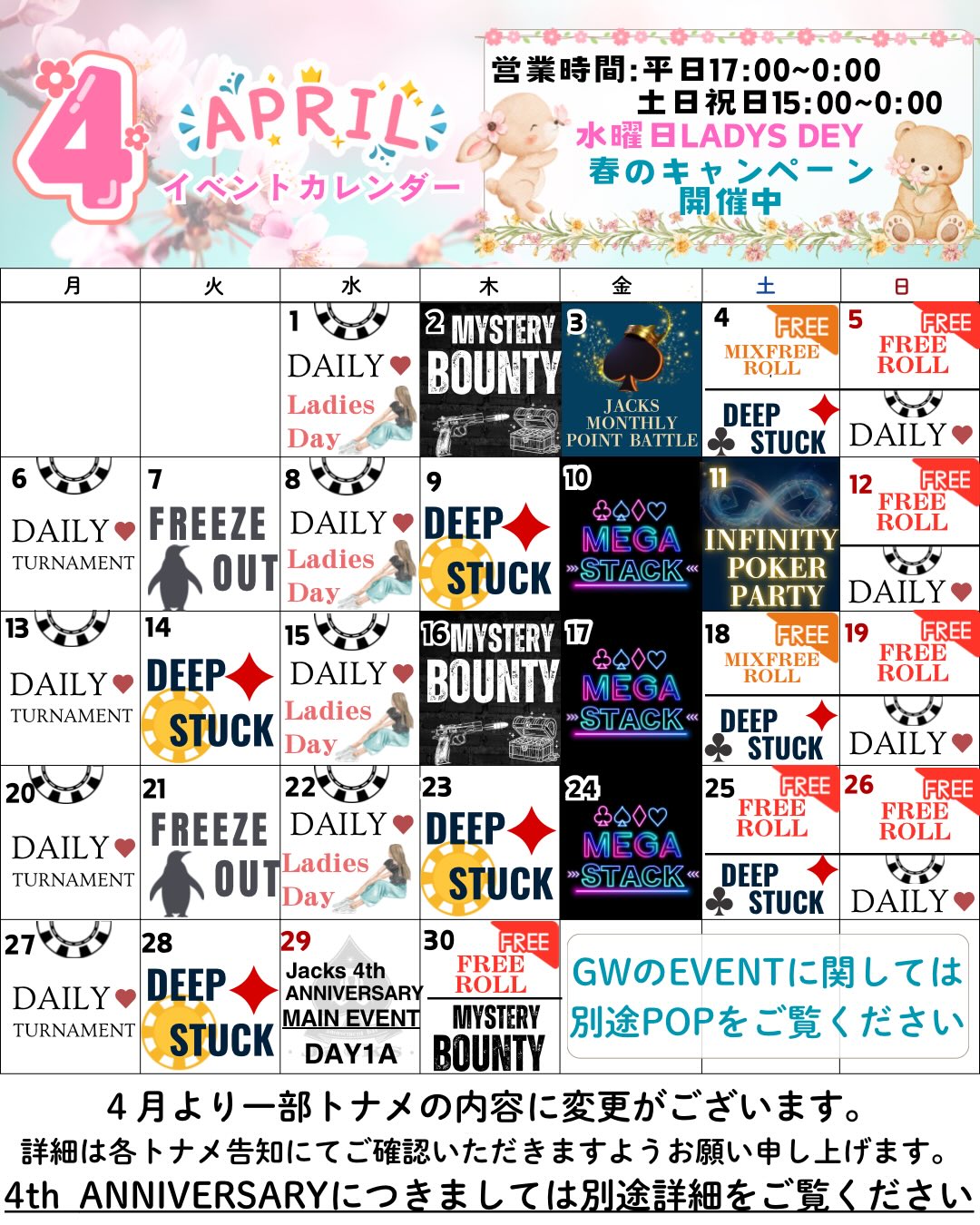 4月も皆様にお楽しみいただけるよう、様々なTOURNAMENT・キャンペーンを開催いたします♠️✨