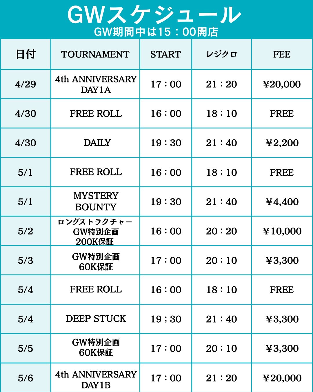 期間中はFREE ROLL🆓や各種レギュラートーナメントも開催しております。